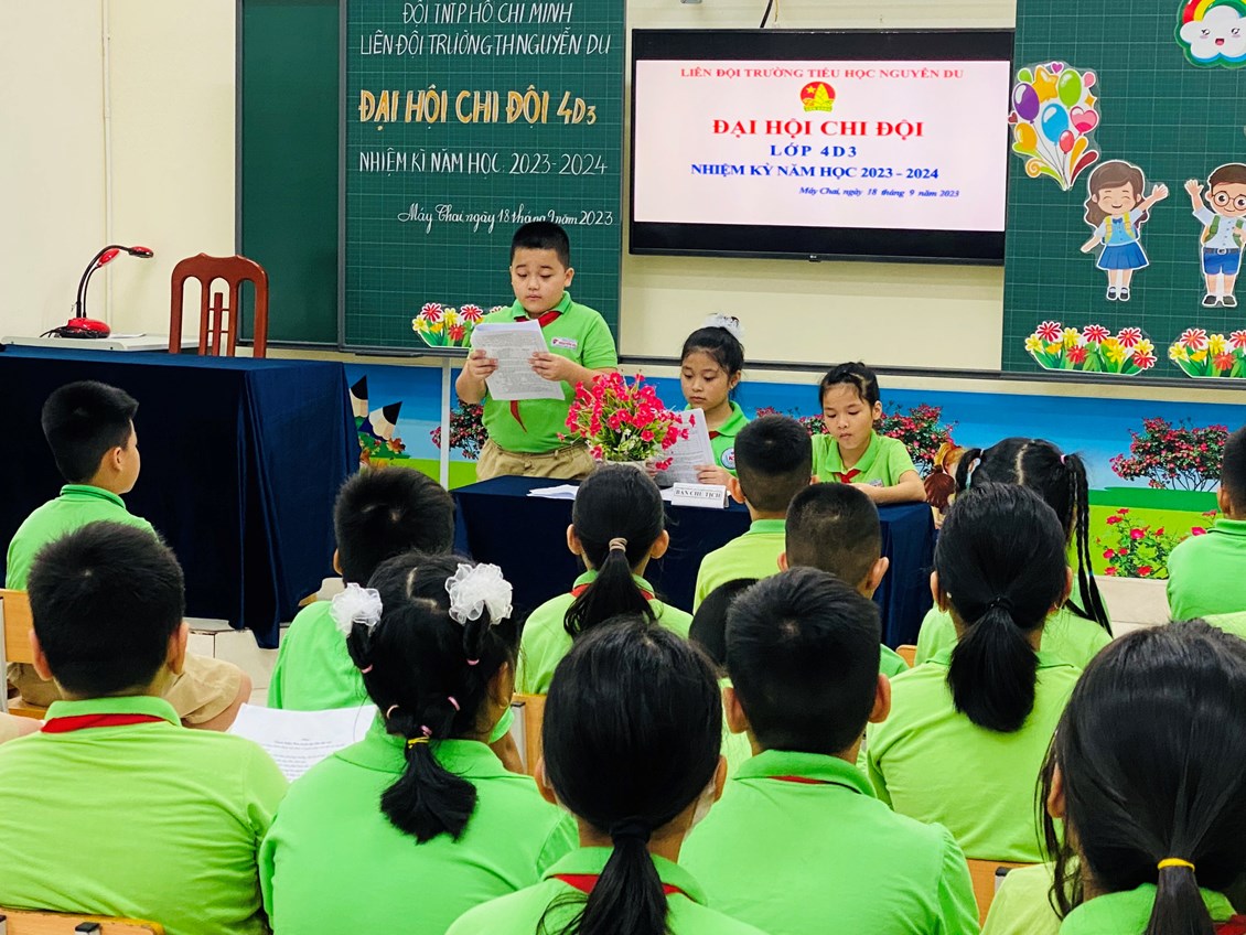 Thực hiện kế hoạch công tác Đội và phong trào thiếu nhi năm học 2023 - 2024, sáng ngày 24/9/2023, chi đội 4D3 đã tổ chức thành công đại hội chi đội nhiệm kì năm học 2023- 2024 .Tới dự đại hội có cô Đỗ Hải Hà (Phó hiệu trưởng nhà trường), cô Lưu Thị Xuân ( Bí thư Chi đoàn giáo viên), Ban thiếu nhi nhà trường ,Ban chỉ huy các Chi đội khối 4,5 và toàn thể Đội viên Chi đội lớp 4D3 đã về dự đông đủ.