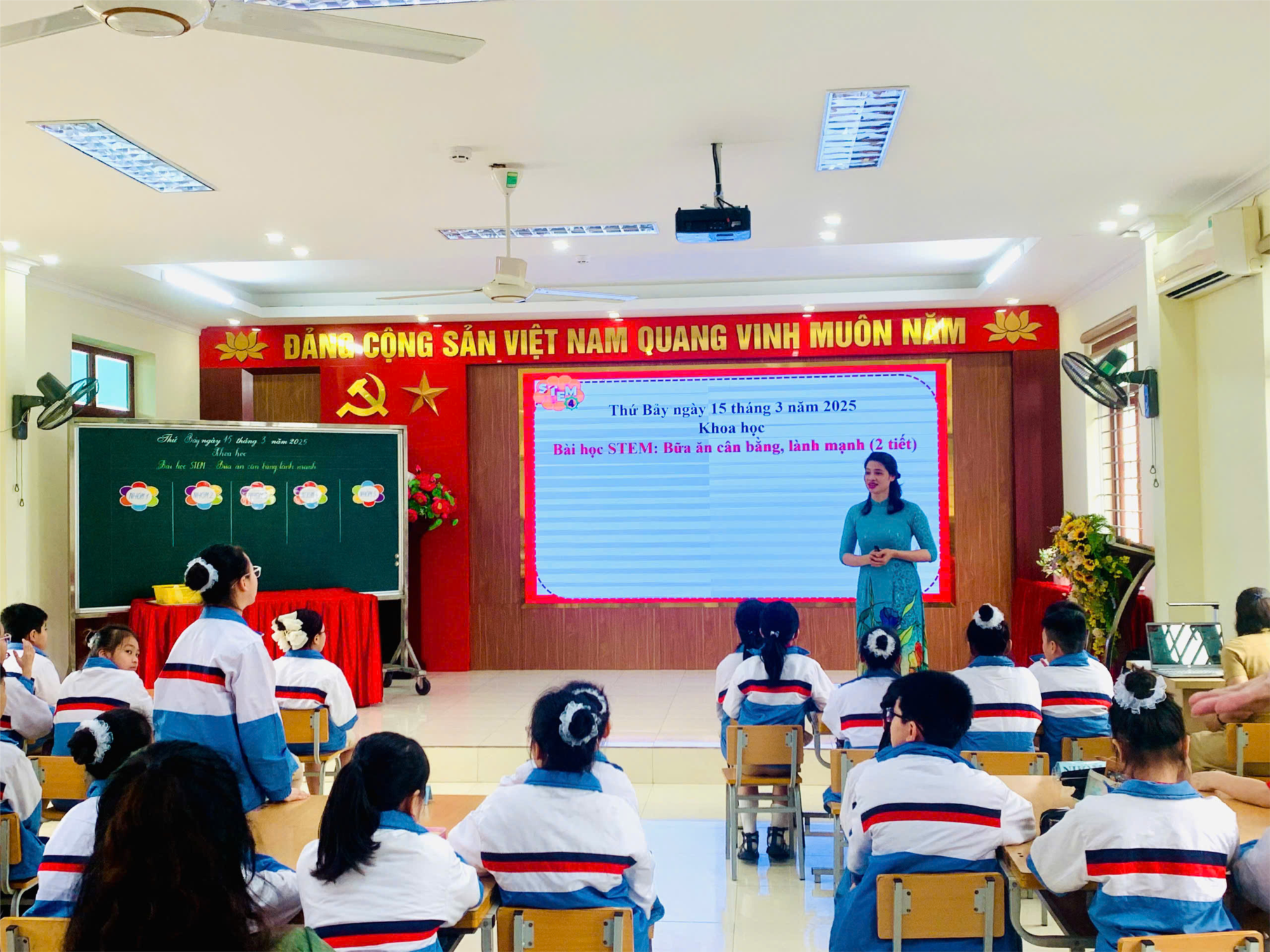 Thực hiện Công văn số 909/BGDĐT-GDTH ngày 08/3/2023 của BGD&ĐT về việc hướng dẫn tổ chức hoạt động giáo dục STEM trong giáo dục Tiểu học, thực hiện Kế hoạch chuyên môn năm học 2024 – 2025 của trường TH Nguyễn Du, sáng ngày 15/4/2025 tập thể giáo viên Khối 4 thực hiện chuyên đề cấp trường môn Khoa học “Bài học STEM: Bữa ăn cân bằng, lành mạnh". Bài học được thiết kế dạy trong 3 tiết (Tiết 1 và tiết 2: cung cấp kiến thức nền. Tiết 3: Vận dụng thực hành tạo sản phẩm với mô hình là bữa ăn cân bằng).Do điều kiện thời gian có hạn, trong buổi chuyên đề, khối 4 đã thể hiện 2 tiết dạy minh họa là tiết 2 và tiết 3 do cô giáo Phạm Thị Sang và Lưu Thị Xuân thể hiện rất thành công.