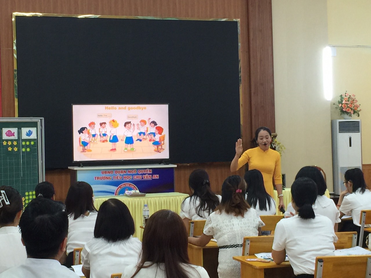 Cô giáo Đinh Thị Dinh, giáo viên trường Tiểu học Nguyễn Du, đại diện cho nhóm các trường Tiểu học Chu Văn An, Tiểu học Nguyễn Du, Tiểu học Nguyễn Khuyến, Tiểu học Nguyễn Thượng Hiền thực hiện lên lớp tiết chuyên đề: Unit 1: Hello/ Lesson 2: Activity 4,5,6/p13 – Bộ sách Tiếng Anh 3 global success. Thông qua các hoạt động học tập, bằng phong cách dạy học nhiệt tình, vui nhộn cô giáo Đinh Thị Dinh đã cuốn hút học sinh tham gia tiết học một cách hào hứng, tự nhiên. Với đặc trưng của môn ngoại ngữ, rèn 4 kỹ năng nghe - nói - đọc - viết. Tiết dạy đã thể hiện rõ hai kỹ năng nghe và nói.
