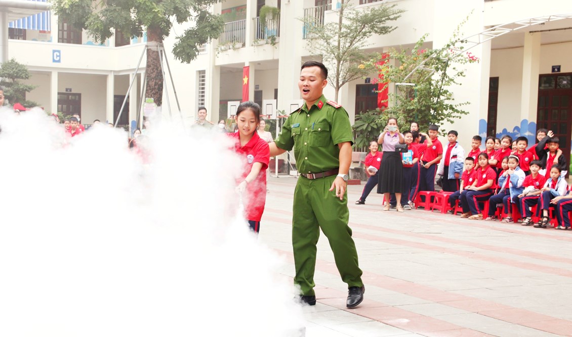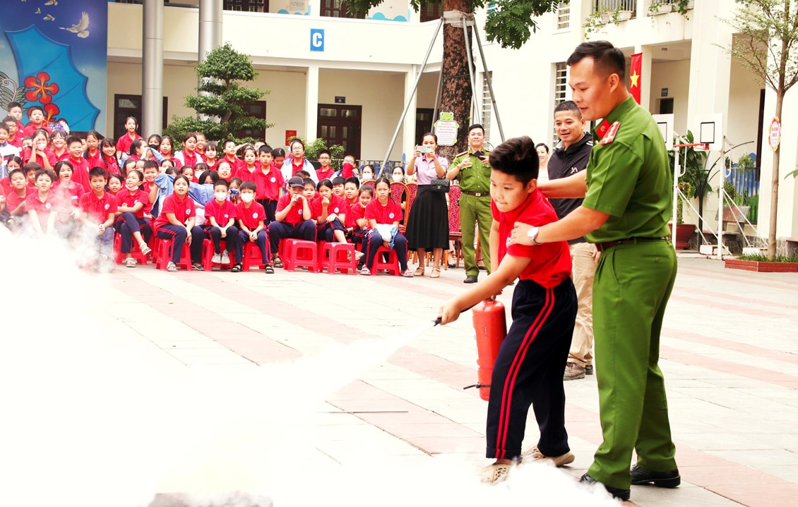 Đồng thời, không chỉ riêng các đ/c cán bộ viên chức, người lao động mà cả các em học sinh còn trực tiếp thực hành các tình huống giả định cụ thể để thực hành chữa cháy như: hướng dẫn và thực hành sử dụng hai loại bình chữa cháy thông dụng là bình bọt MFZ4 và bình khí CO2 để dập tắt đám cháy, triển khai chữa cháy bằng họng nước cứu hỏa, sơ cứu người bị nạn, cứu hộ cứu nạn cho các nạn nhân, xử lý đúng cách khi không có dụng cụ y tế hỗ trợ, cách thoát hiểm khi xảy ra cháy nổ…. và rất nhiều tình huống cụ thể khác.