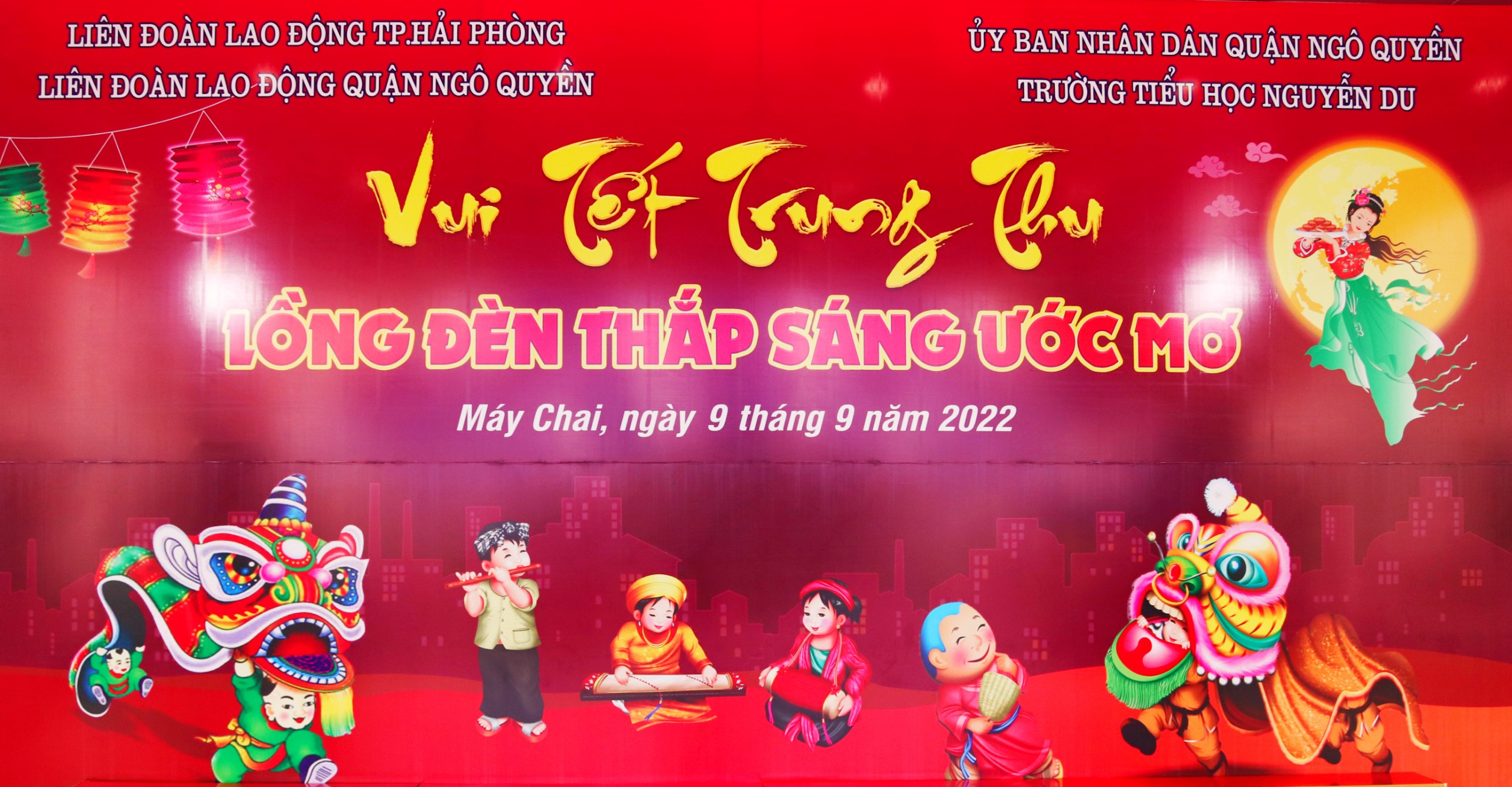 Hòa chung không khí tưng bừng của những ngày mùa thu tháng 9 – những ngày đầu năm học mới. Chiều ngày 9 tháng 9 năm 2022 (tức ngày 14 tháng 8 âm lịch), Liên đoàn Lao động quận Ngô Quyền kết hợp với Trường Tiểu học Nguyễn Du tổ chức Chương trình Vui Tết trung thu năm 2022 với chủ đề “ Lồng đèn thắp sáng ước mơ”. Chương trình là dịp để khích lệ tinh thần các em học sinh, để các em đón 1 mùa Trung thu ấm áp, vui vẻ và ý nghĩa
